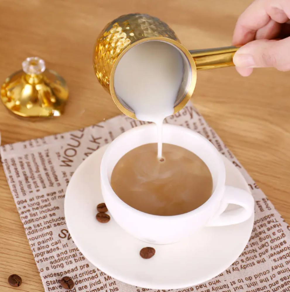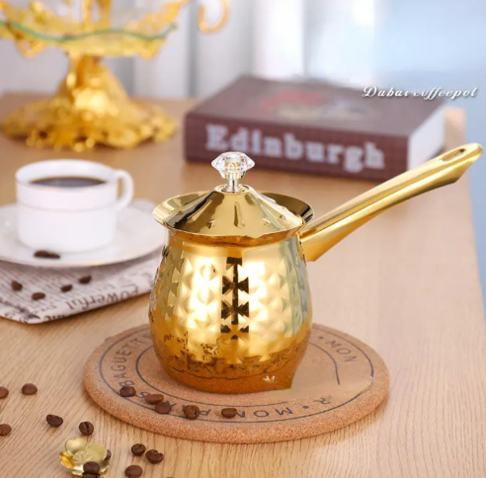 ركوة انيقه من الستانليس ستيل 400مل مع غطاء بكرستاله مميزه و مقبض طويل لسهولة الصب , تصميم عملي و فاخر يحافظ على حرارة القهوة و نكهتها الأصيلة