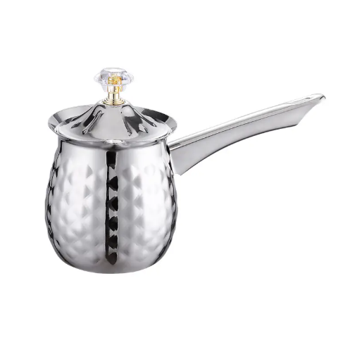 ركوة انيقه من الستانليس ستيل 400مل مع غطاء بكرستاله مميزه و مقبض طويل لسهولة الصب , تصميم عملي و فاخر يحافظ على حرارة القهوة و نكهتها الأصيلة