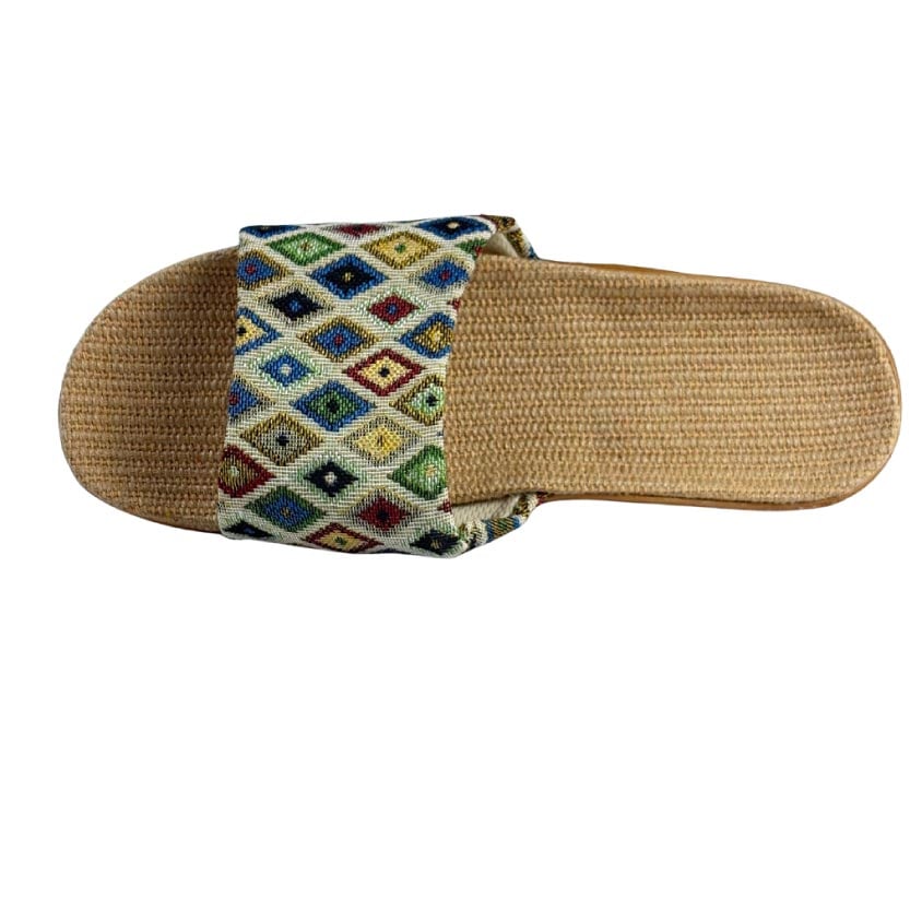 شبشب منزلي أنيق بتصميم مفتوح الأصابع، مصنوع من خامة منسوجة مريحة وخفيفة، مع حزام علوي مزخرف بنقشات هندسية ملونة تضيف لمسة جمالية مميزة. يتميز النعل بخامة طبيعية تمنح القدم راحة وتهوية مثالية، ليكون الخيار الأمثل للاستخدام اليومي في المنزل، خصوصًا في الأجواء الحارة.