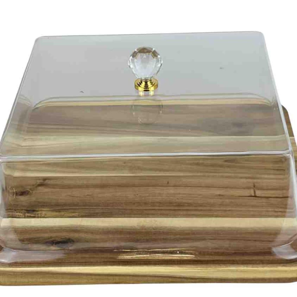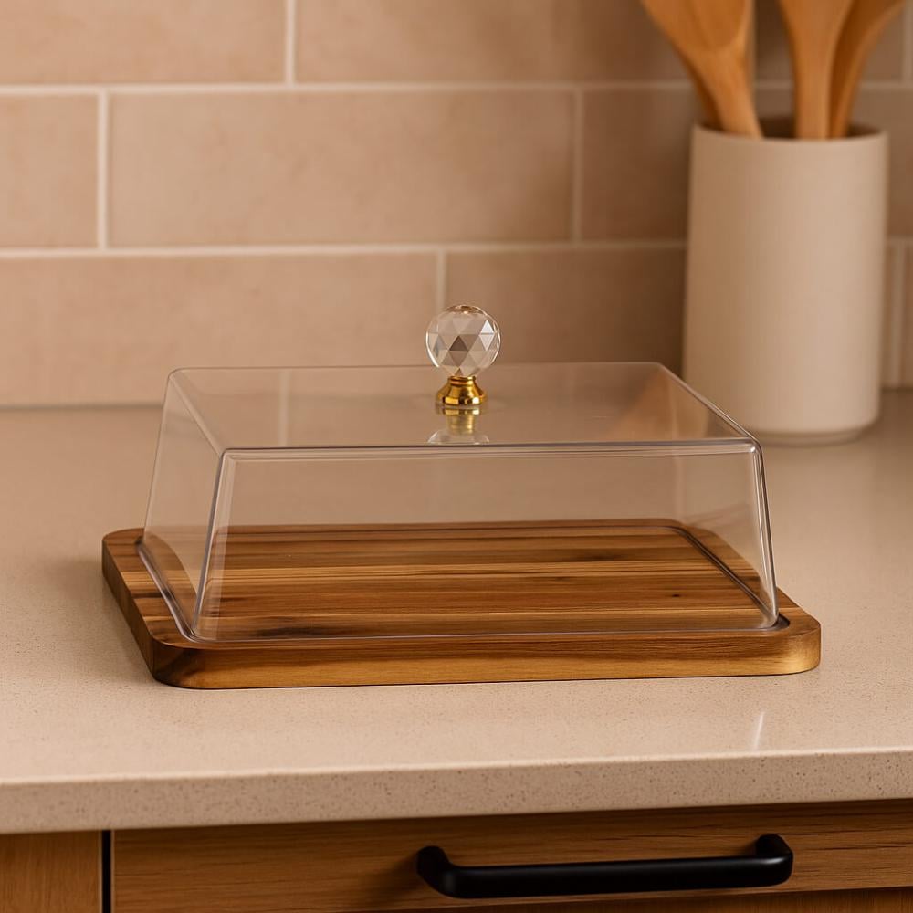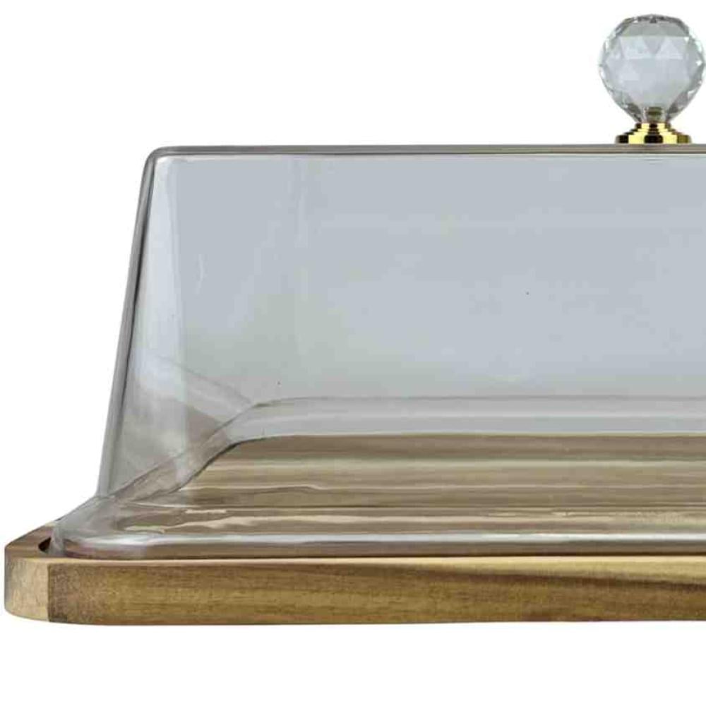 صحن تقديم فاخر يجمع بين الأناقة والعملية، يأتي بقاعدة مستطيلة مصنوعة من الخشب الطبيعي وغطاء زجاجي شفاف مزوّد بمقبض كريستالي ذهبي أنيق. مثالي لتقديم الجبن، المعجنات، الكيك أو المقبلات بطريقة تحفظ النكهة وتضيف لمسة فخامة لمائدة التقديم. تصميمه العصري يتماشى مع مختلف ديكورات المطابخ والطاولات.