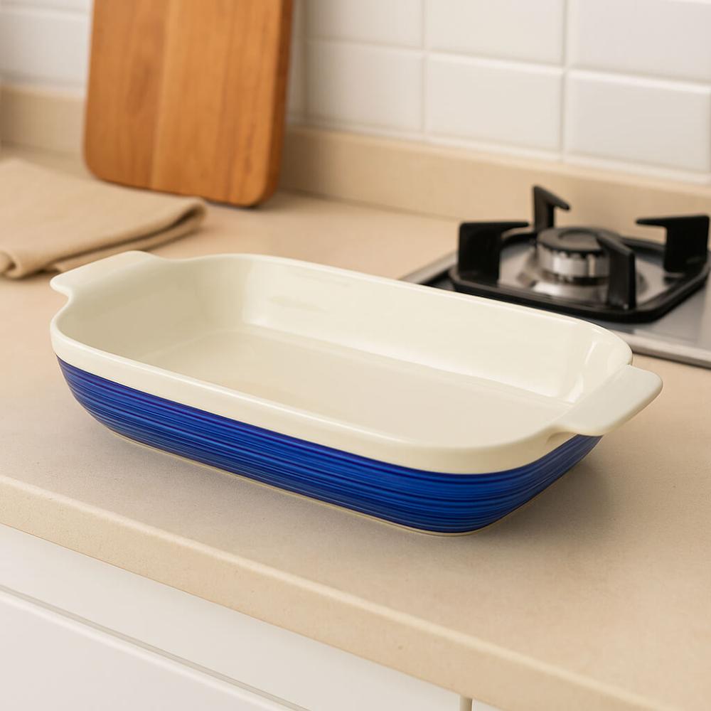 صينية فرن سيراميك مستطيلة – بخطوط زرقاء