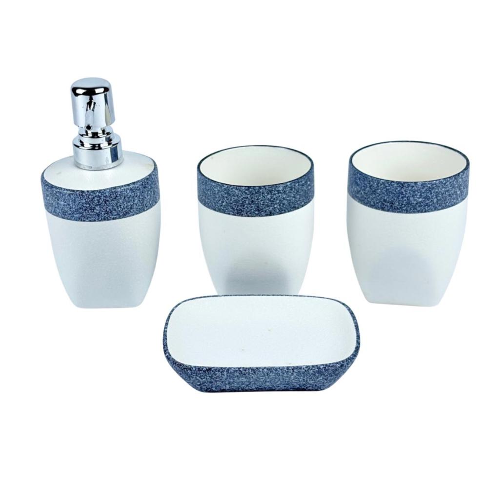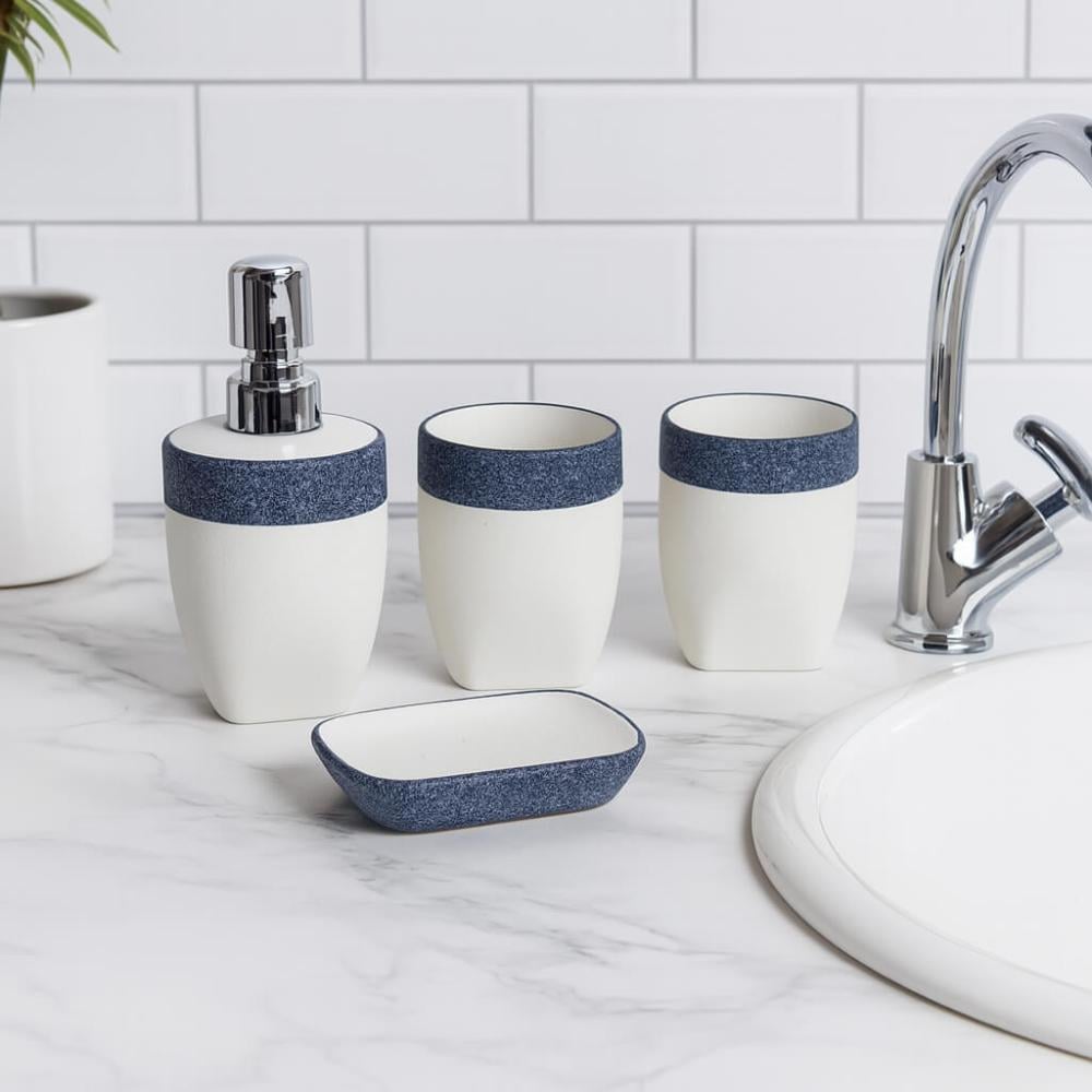 طقم إكسسوارات حمام 4 قطع بتصميم أبيض وحافة زرقاء