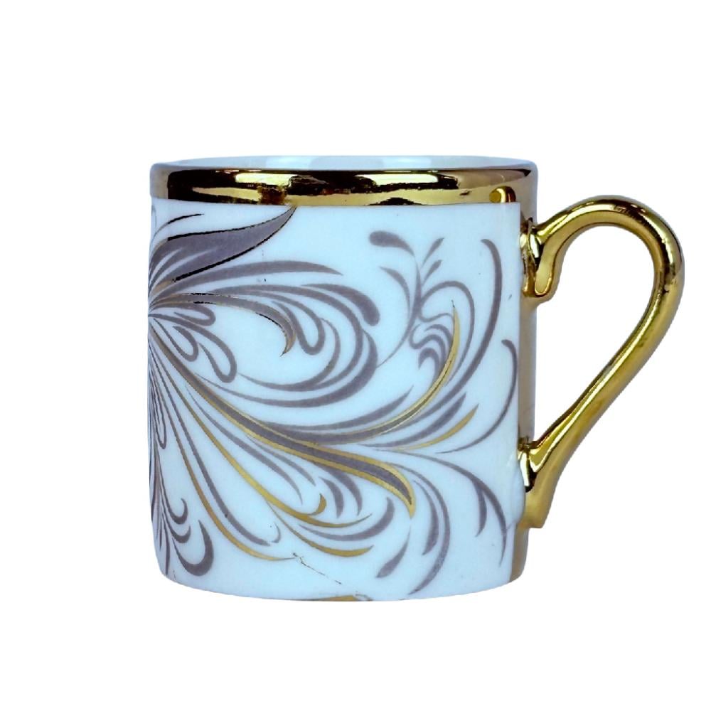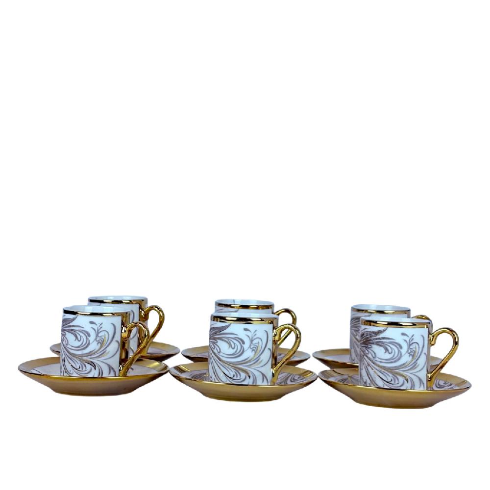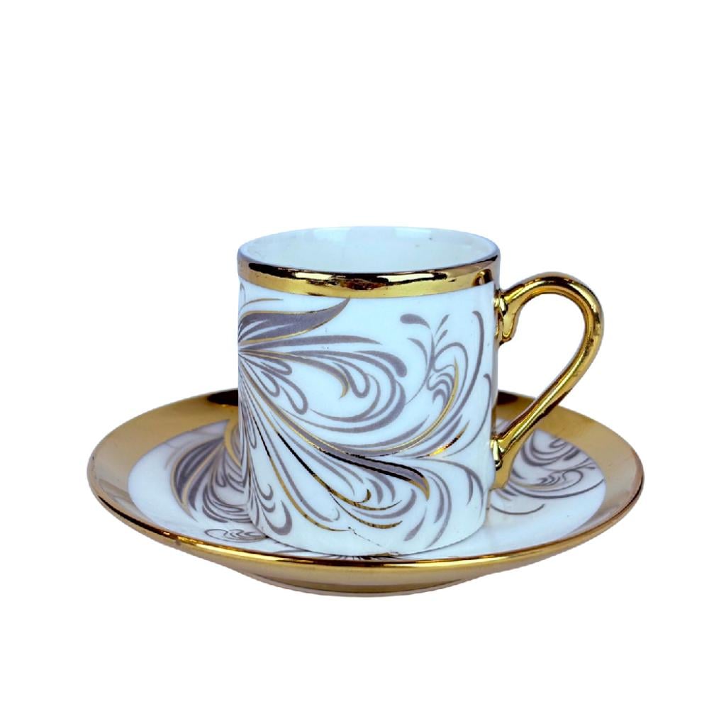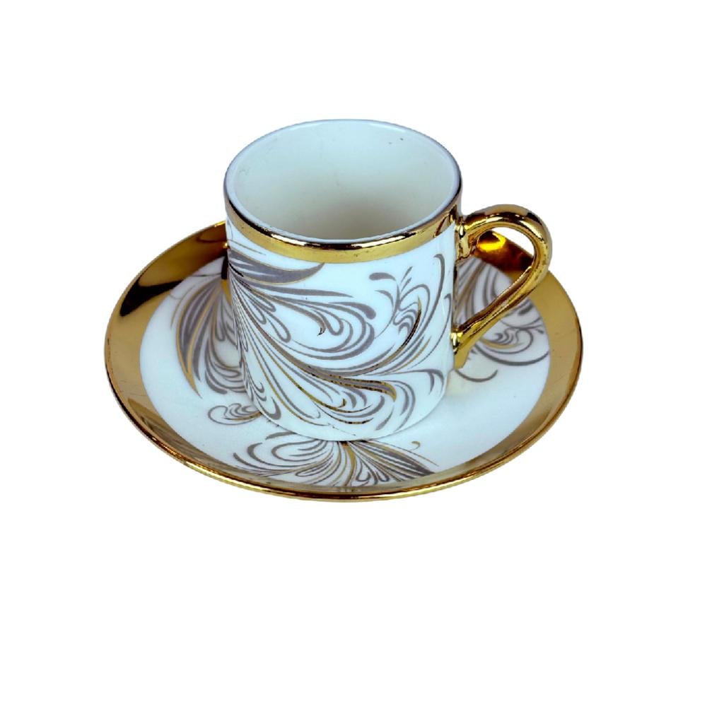 طقم قهوة أنيق يجمع بين الفخامة والرقي، يتكوّن من ستة فناجين مع صحون بتصميم رخامي مزين بإطار ذهبي لامع ومقبض أنيق باللون الذهبي. مصنوع من البورسلان الفاخر ليمنح جلسات القهوة لمسة فخمة تناسب الضيافة الراقية والمناسبات الخاصة.