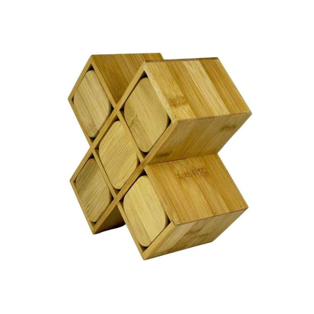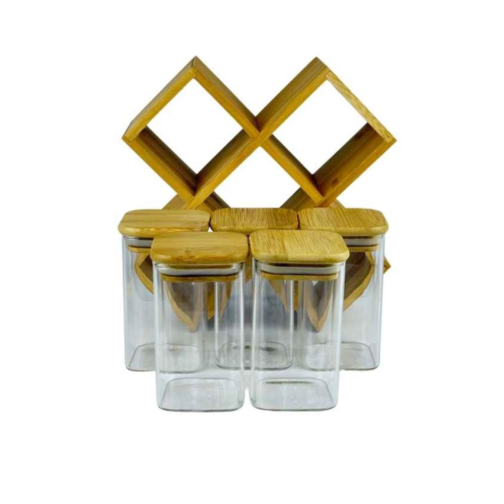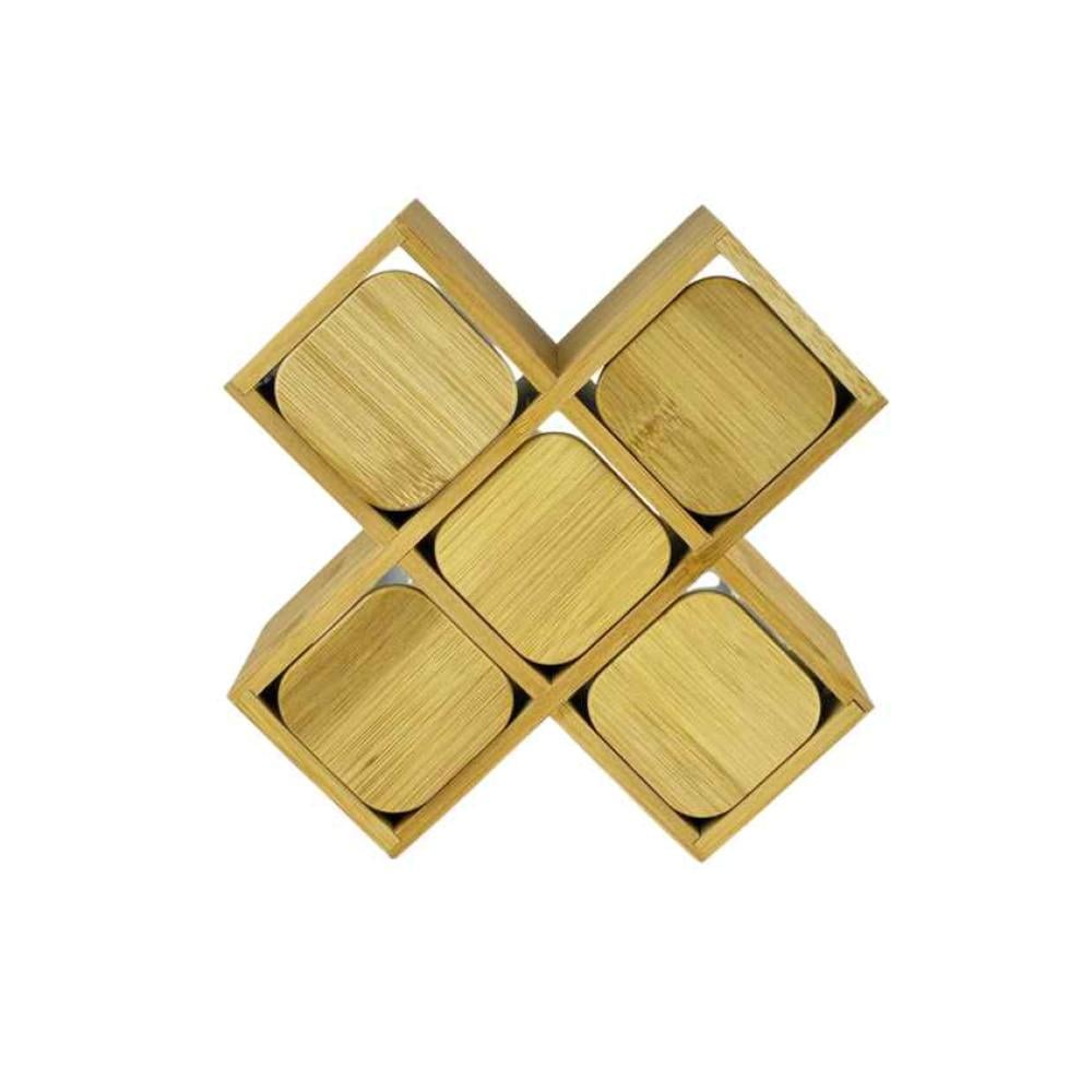 طقم برطمانات أنيق مكوّن من 6 حاويات زجاجية بأغطية من الخيزران، مرتبة بشكل هندسي جذاب على قاعدة خشبية متقاطعة، مثالية لحفظ التوابل أو البهارات. تصميم عملي وجمالي يضفي لمسة طبيعية ومنظمة على مطبخك.