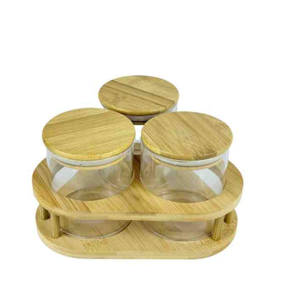 طقم برطمانات زجاجية مع حامل خشبي -3 قطع