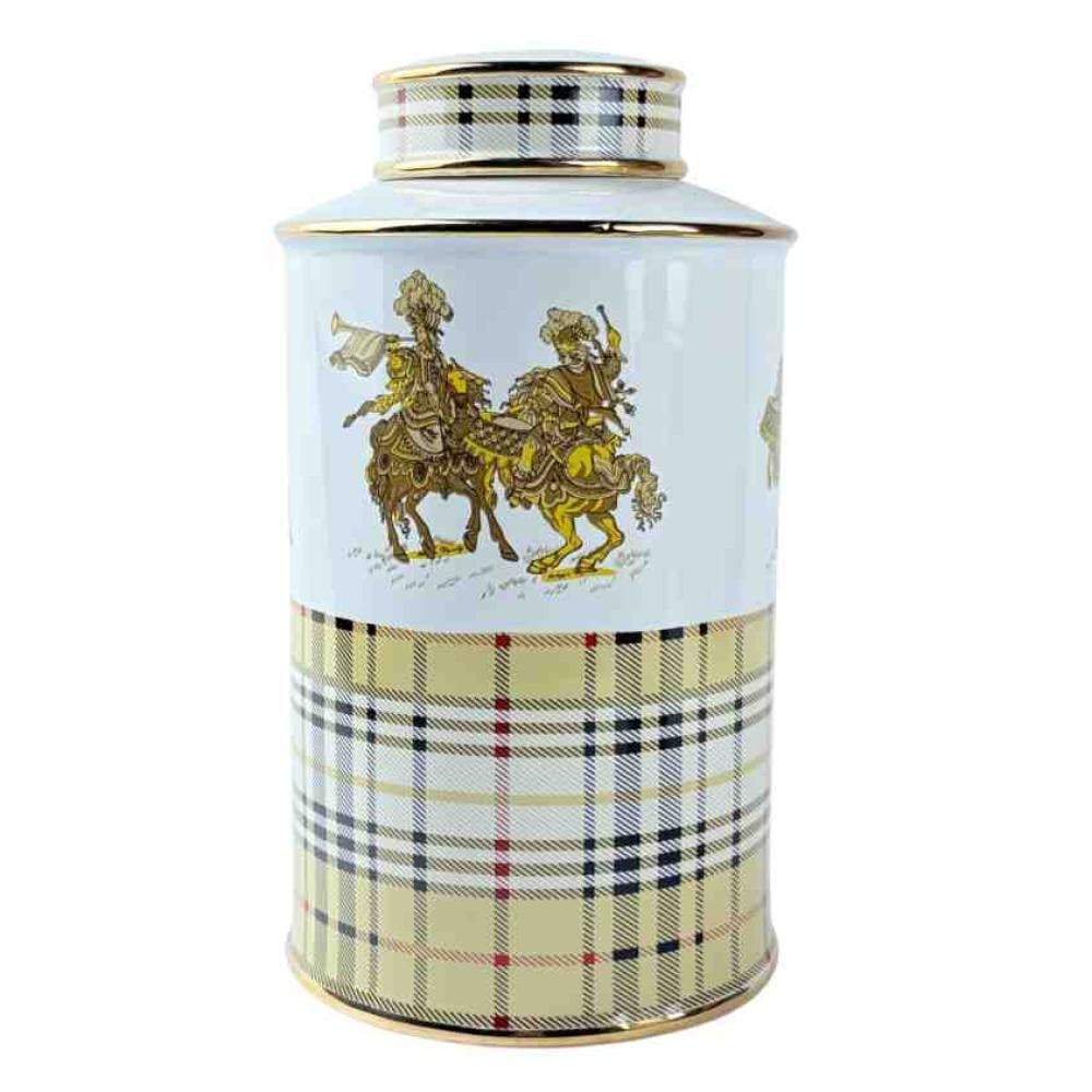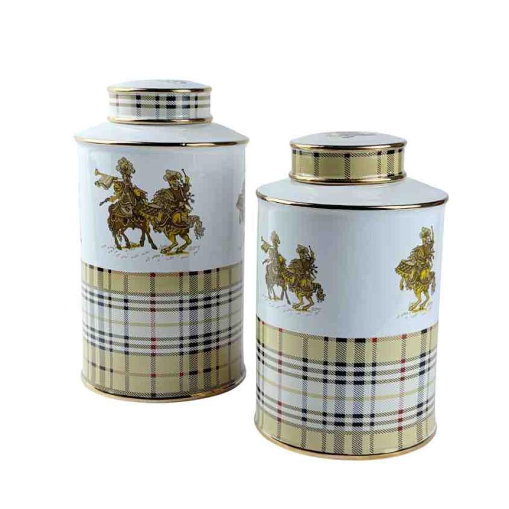 أضف لمسة من الفخامة الكلاسيكية إلى ديكور منزلك مع طقم التحف الديكورية المصنوع بدقة عالية. يتميز هذا الطقم بتصميم اسطواني أنيق يجمع بين النقش الملكي الذهبي المستوحى من الفرسان الكلاسيكيين والنقشة الاسكتلندية الراقية باللون البيج والأسود. مثالي لتزيين غرف المعيشة أو المجالس أو طاولات الاستقبال، ويأتي بقطعتين بأحجام متفاوتة تضيف توازنًا بصريًا جذابًا.