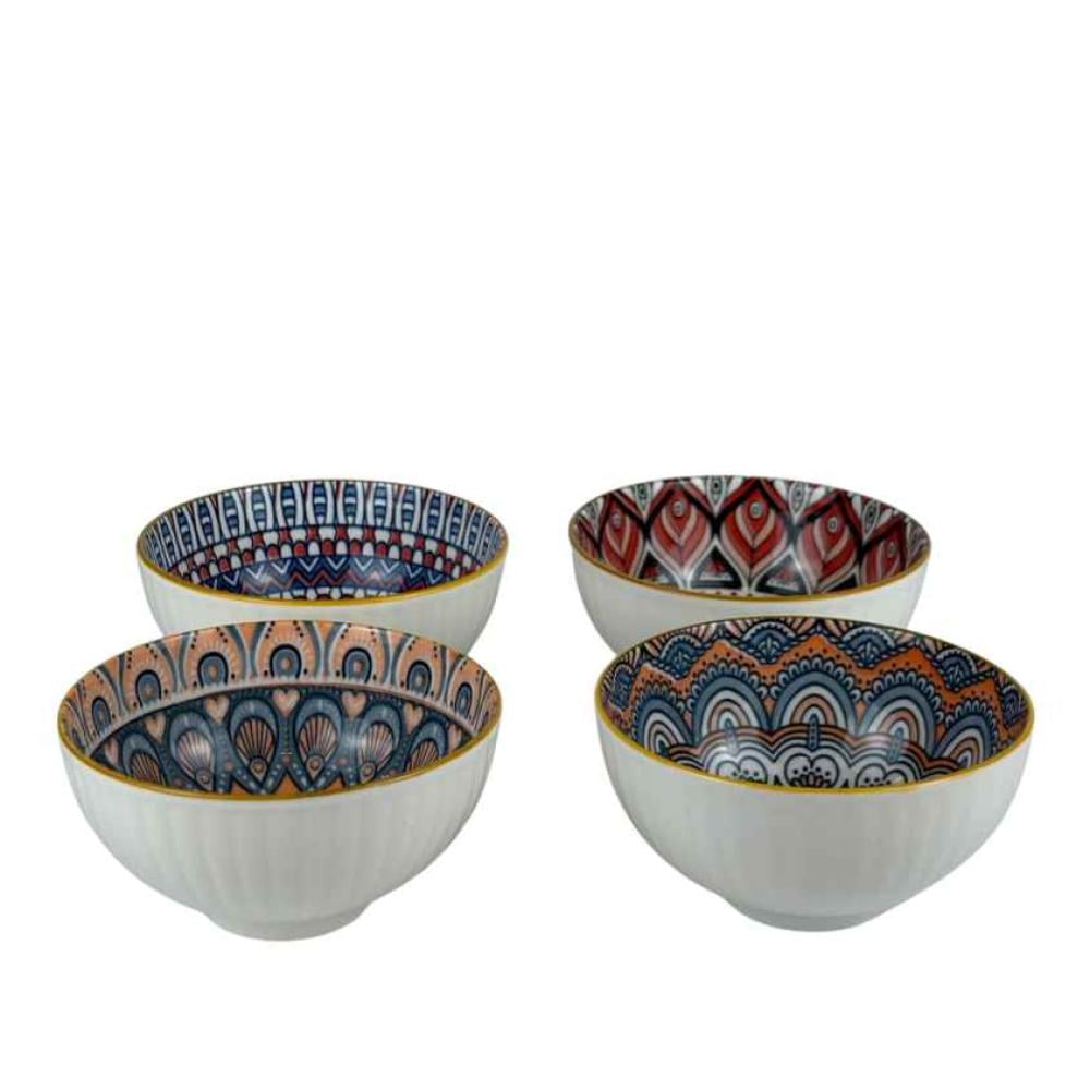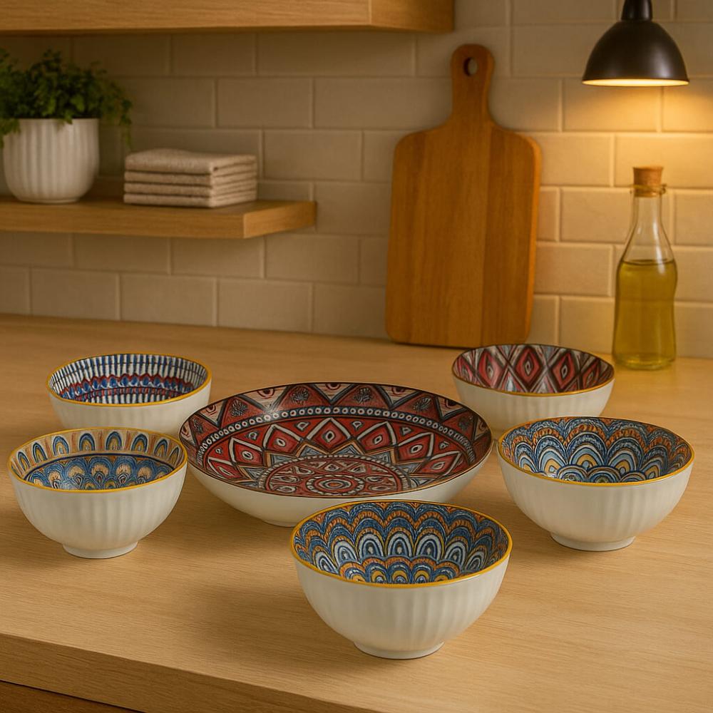 تميّز بتقديمك مع هذا الطقم الفاخر من الأواني السيراميكية الذي يجمع بين الفن العصري والنقوش التقليدية الغنية بالألوان. يتكون الطقم من صحن كبير وأربعة أوعية صغيرة بتصاميم فريدة داخلية تتنوع بين الأحمر، الأزرق، البرتقالي، والذهبي، مما يضفي لمسة جمالية أنيقة على مائدة الضيافة أو الاستخدام اليومي. مصنوع من السيراميك عالي الجودة لتحمل الحرارة وسهولة التنظيف. مثالي لتقديم السلطات، المقبلات، أو الفواكه بأسلوب راقٍ.