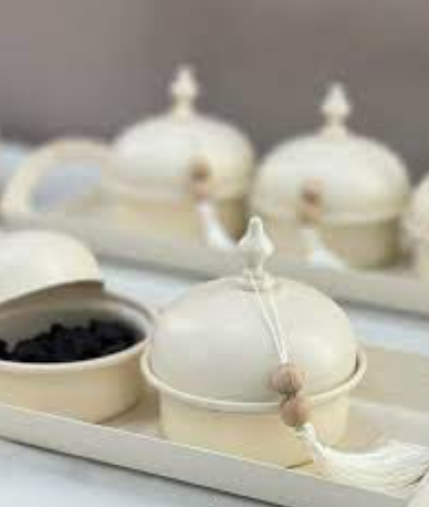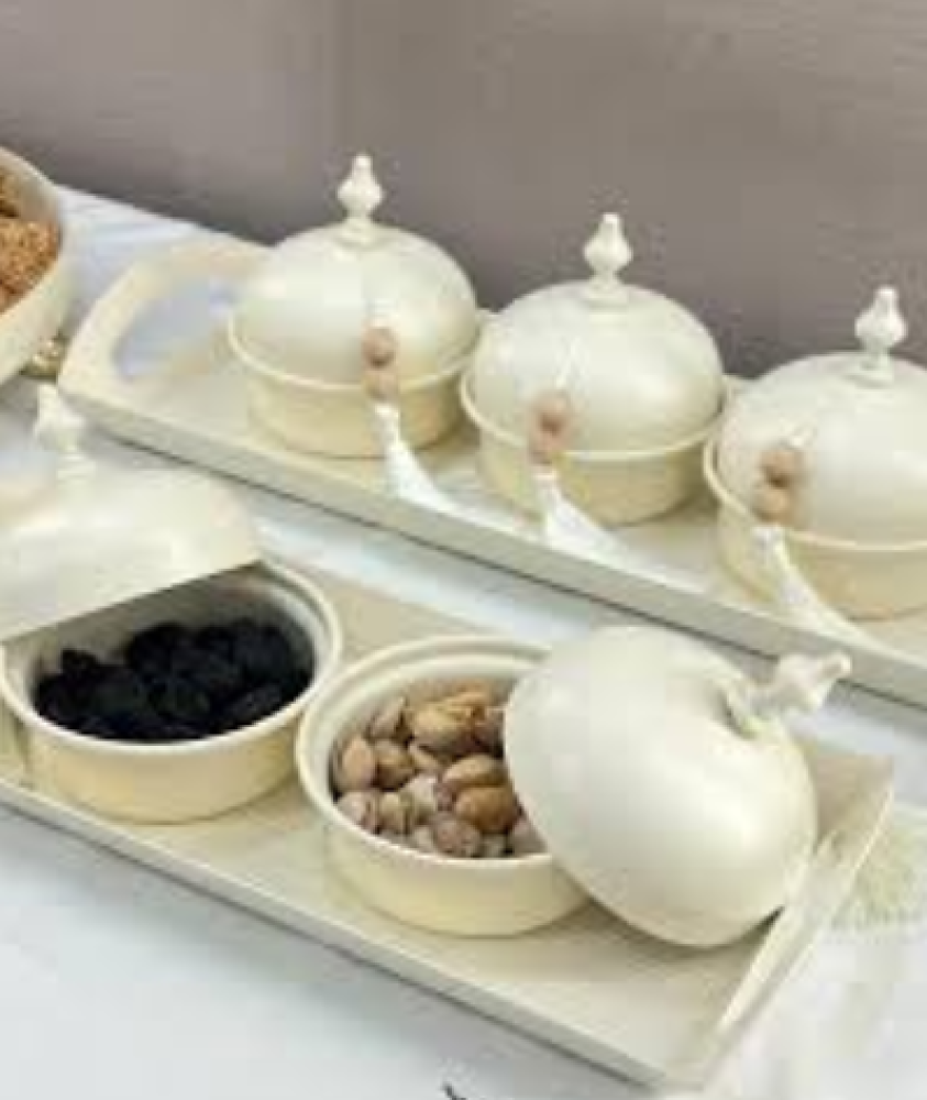 طقم تقديم أنيق يتكون من ثلاث حافظات بغطاء محكم وصينية بتصميم عملي وأنيق، مثالي لتقديم التمر، المكسرات أو الحلويات بطريقة مرتبة وجذابة.