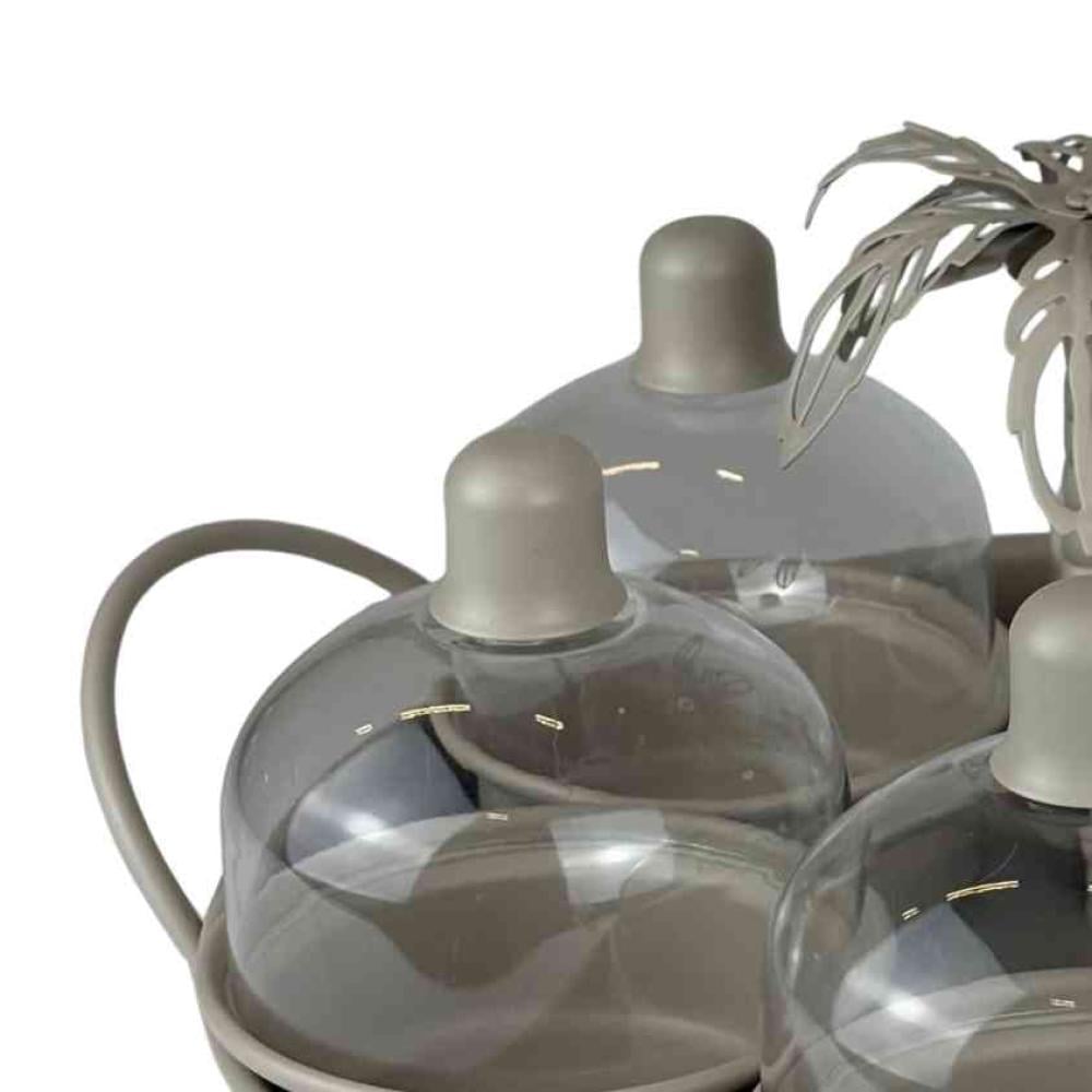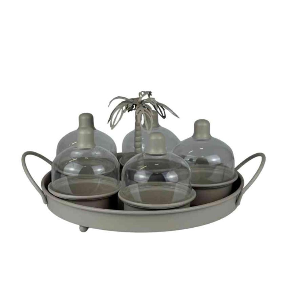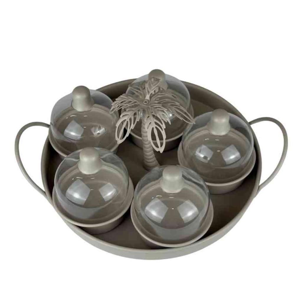 أبهري ضيوفك بطقم التقديم الفاخر المصمم بذوق رفيع ولمسة تراثية عصرية. الطقم يتكون من 6 حاويات أنيقة بغطاء زجاجي شفاف وقاعدة بلون بيج مطفي، مرتبة بشكل دائري في صينية بتصميم أنيق ومقبضين جانبيين، مع نخلة معدنية في المنتصف تضيف لمسة جمالية فريدة.
