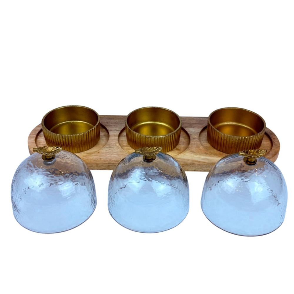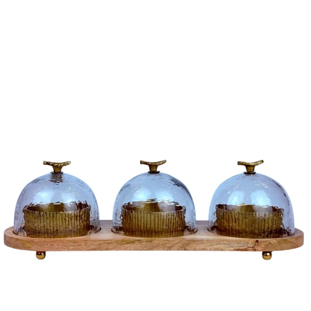 طقم تقديم مكسرات وتمور بثلاث حاويات بقاعدة خشبية وأغطية زجاجية