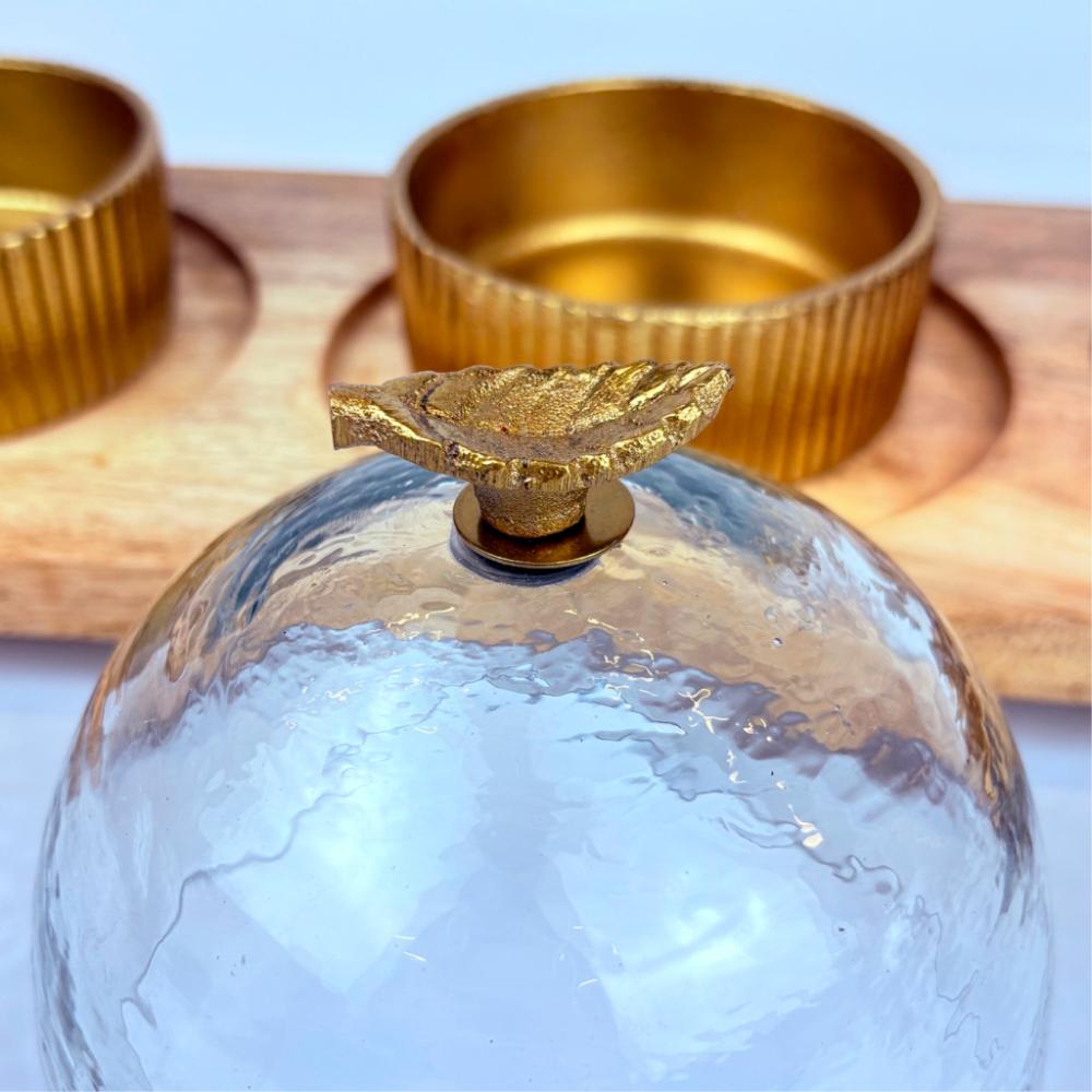طقم أنيق ومثالي لتقديم التمور والمكسرات بأسلوب راقٍ. يتكوّن من ثلاث حاويات ذهبية بغطاء زجاجي شفاف بتصميم مقبض فاخر، مثبتة على قاعدة خشبية متينة تضيف لمسة دافئة للمكان.