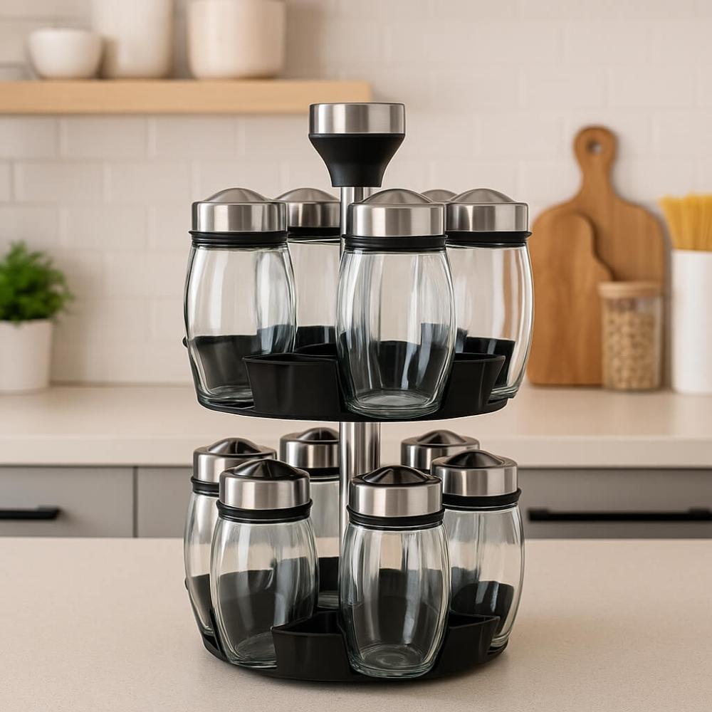 طقم بهارات دوّار أنيق ومتين، يتضمن 12 برطمان زجاجي شفاف بأغطية من الستانلس ستيل، مرتبة على حامل دوّار من طبقتين بتصميم عملي يوفر سهولة الوصول والتنظيم. مثالي لحفظ مختلف أنواع التوابل والبهارات في المطبخ، ويضفي لمسة عصرية على سطح العمل. قاعدة ثابتة بتصميم مدمج لتوفير المساحة وسهولة الاستخدام اليومي.