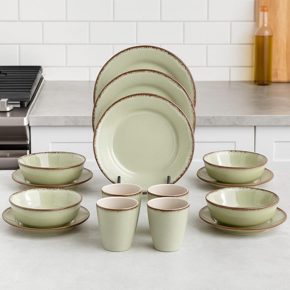 أضف لمسة أنيقة إلى مائدتك مع طقم السفرة المكون من 16 قطعة بتصميم ريفي أنيق. يتميز الطقم بلون أخضر زيتوني هادئ مع حواف بنية ناعمة تضيف طابعاً طبيعياً دافئاً. يتضمن أطباقاً مسطحة، أطباق شوربة، أكواب، وأطباق جانبية مصنوعة من السيراميك عالي الجودة. مثالي للاستخدام اليومي أو المناسبات الخاصة، ويجمع بين المتانة والجمال في كل قطعة