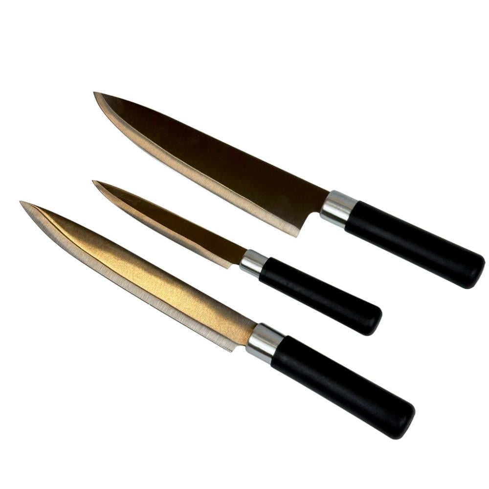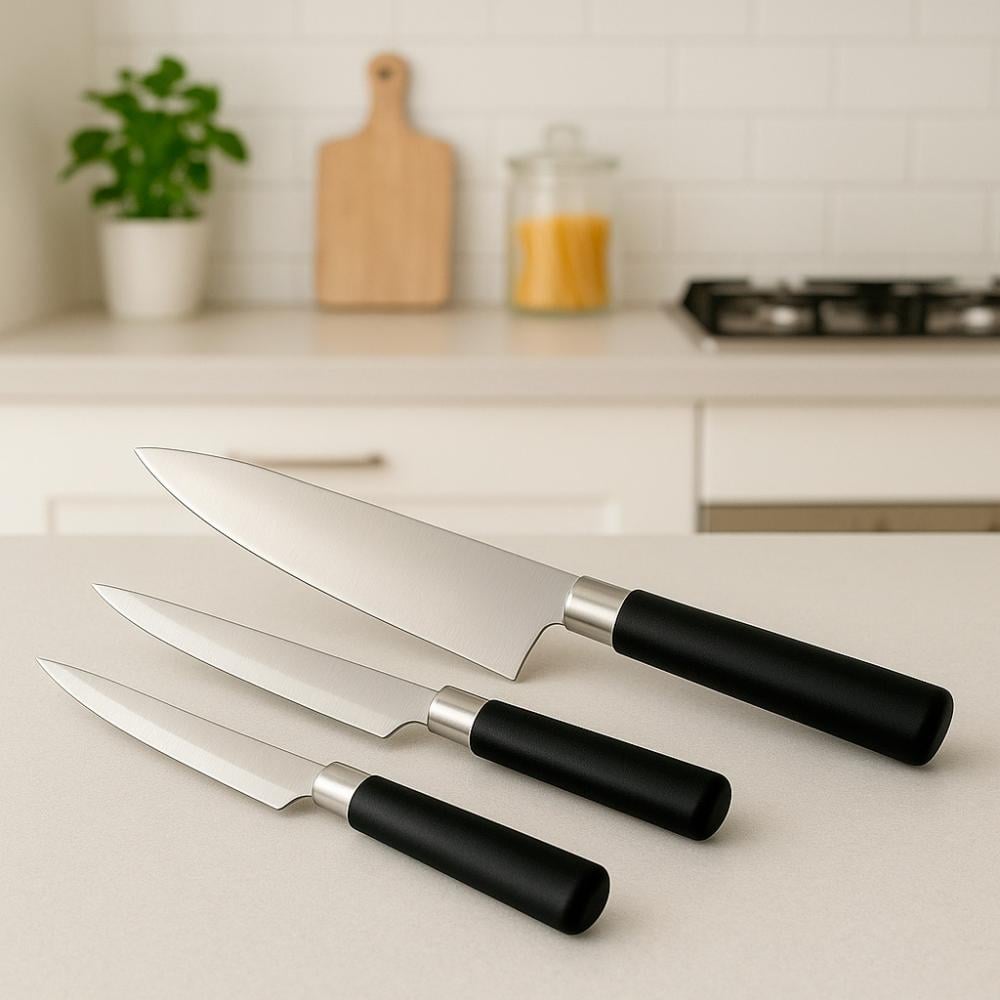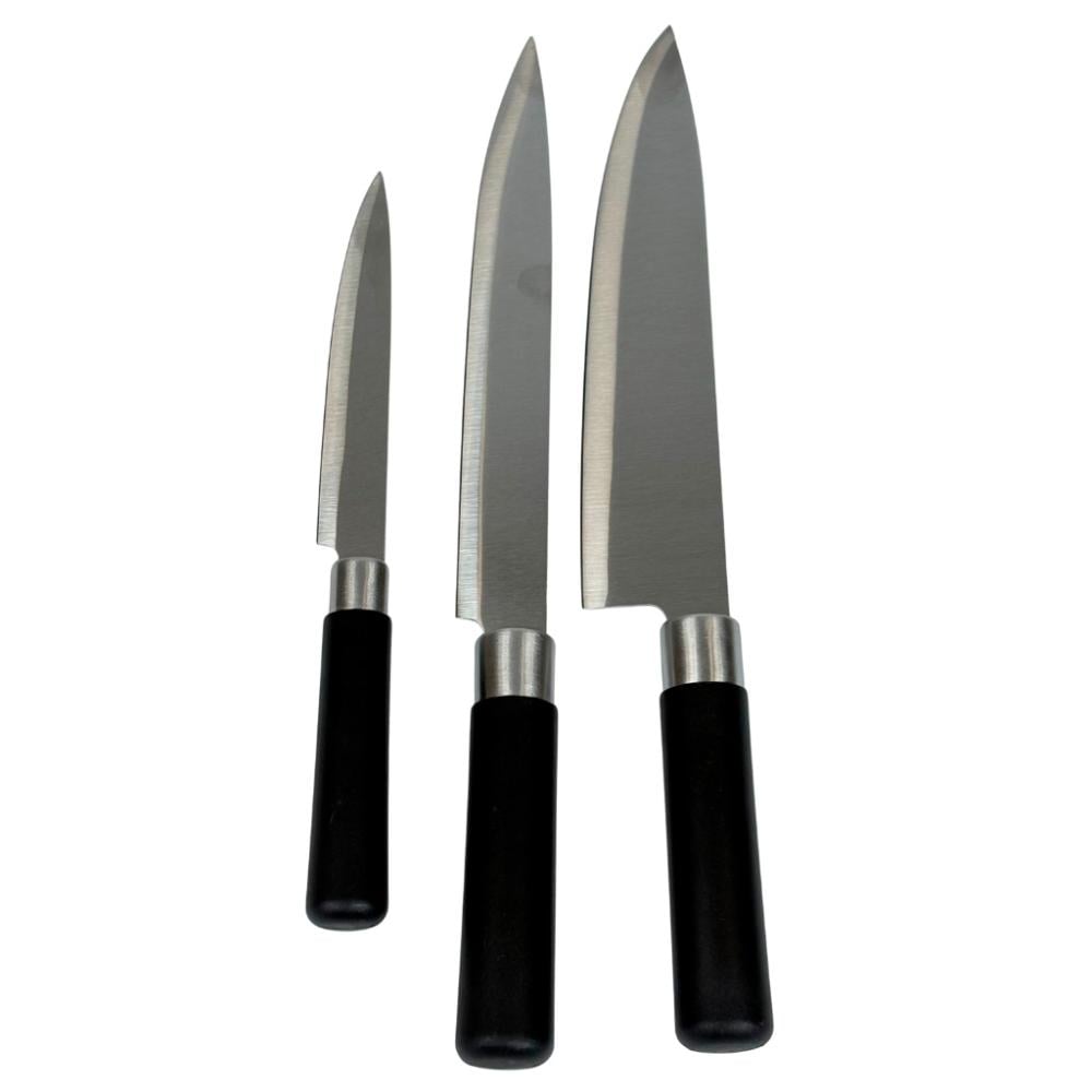 طقم سكاكين حادة من الستانليس ستيل مكون من 3 قطع , يتميز بشفرات قوية و دقيقة لتقطيع مختلف أنواع الطعام بسهولة , مع تصميم عملي يناسب الإستخدام اليومي