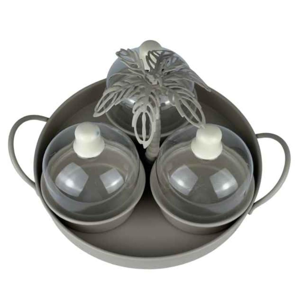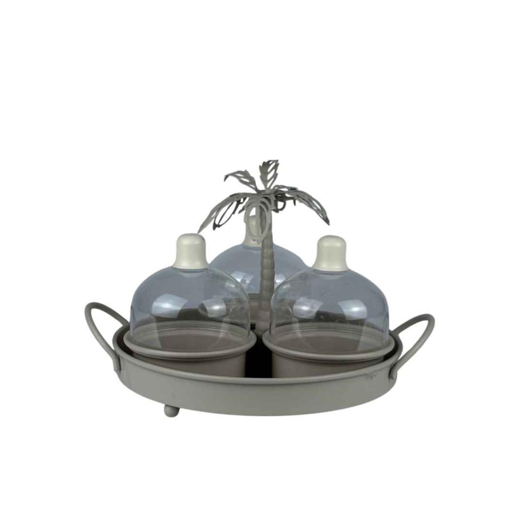 أضف لمسة فاخرة وأصيلة إلى ضيافتك مع هذا الطقم العصري المميز، الذي يضم ثلاثة أوعية تقديم صغيرة بأغطية زجاجية شفافة مرتبة على صينية دائرية أنيقة تتوسطها نخلة بتصميم فني جذاب.