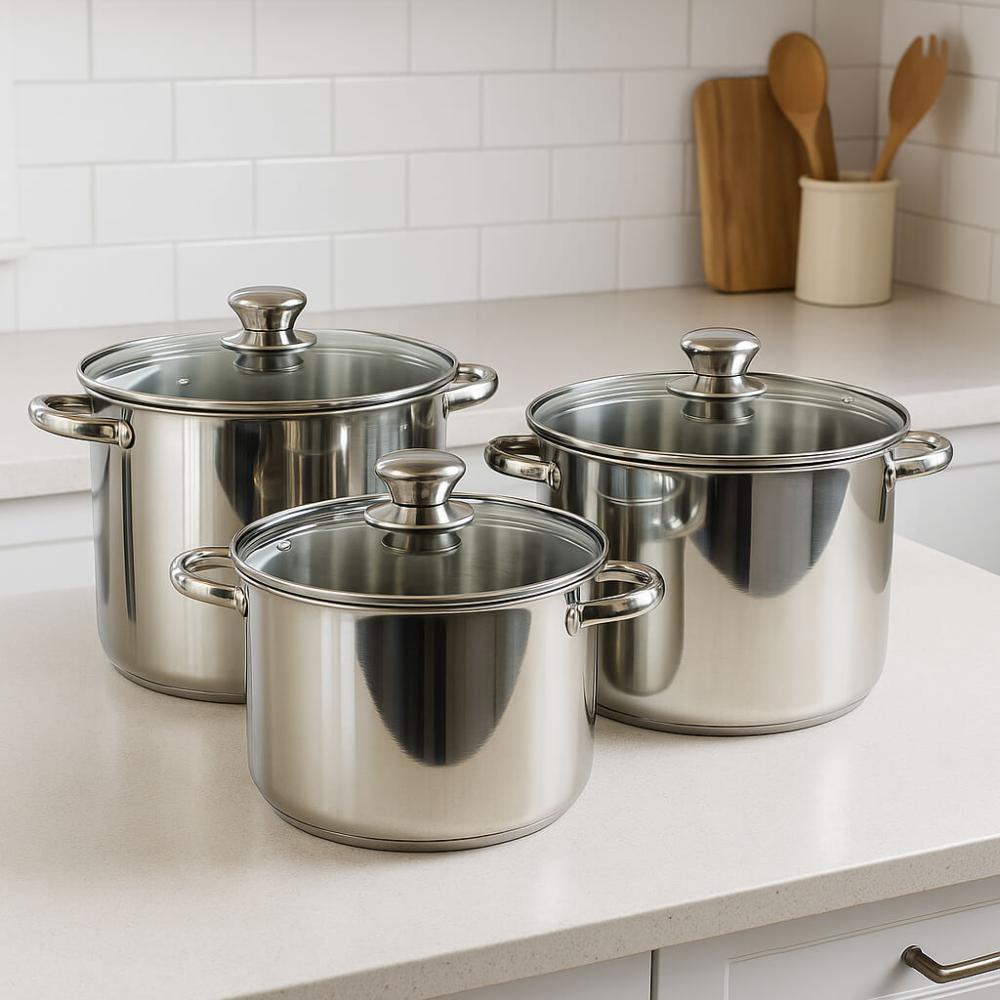 الطقم مكوّن من 3 قدور بمقاسات مختلفة، مصنوع من ستانلس ستيل عالي الجودة، متين وسهل التنظيف.