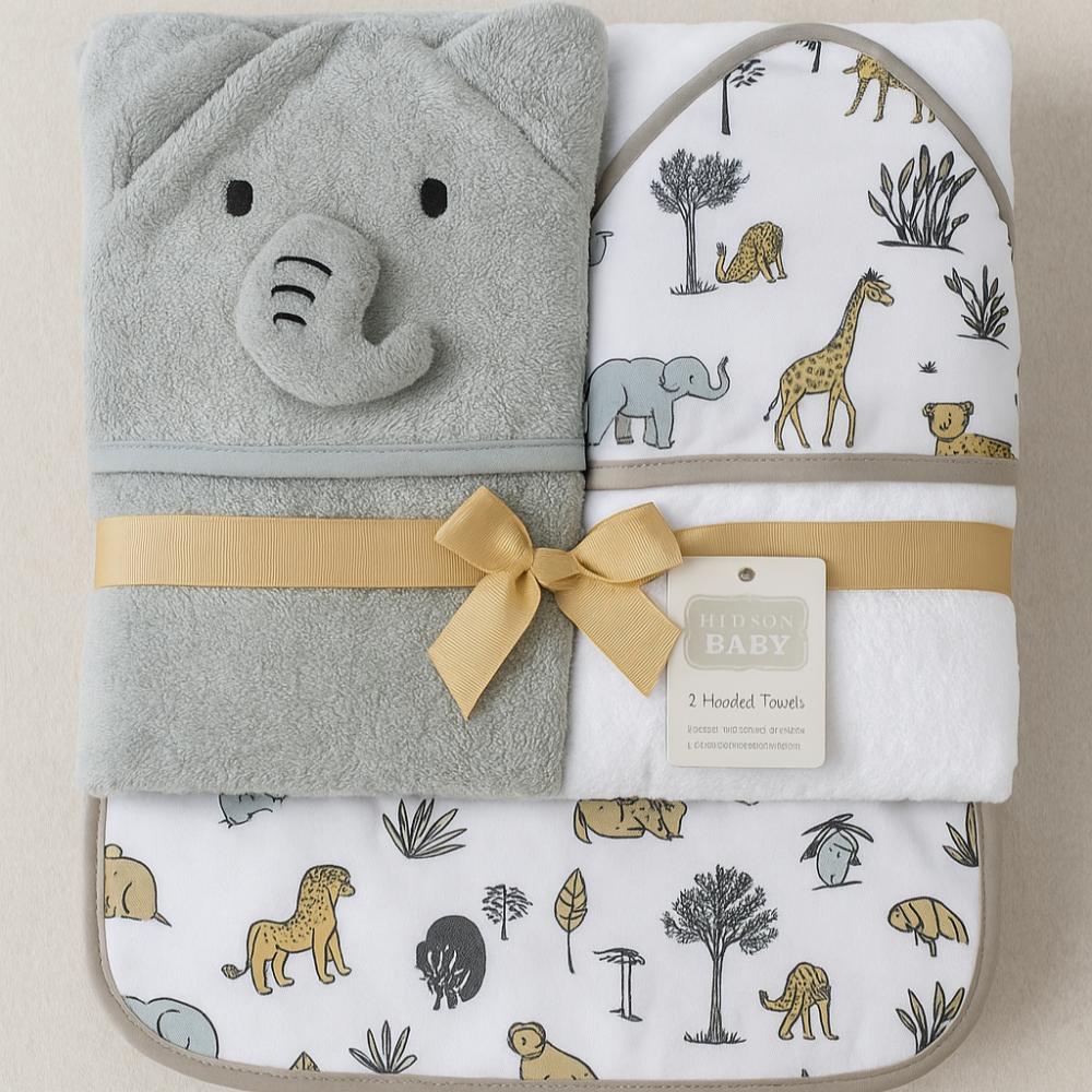 امنحي صغيرك تجربة دافئة ومريحة بعد الاستحمام مع طقم مناشف الأطفال المزود بغطاء للرأس بتصميم حيوانات لطيفة مثل الفيل والأسد.