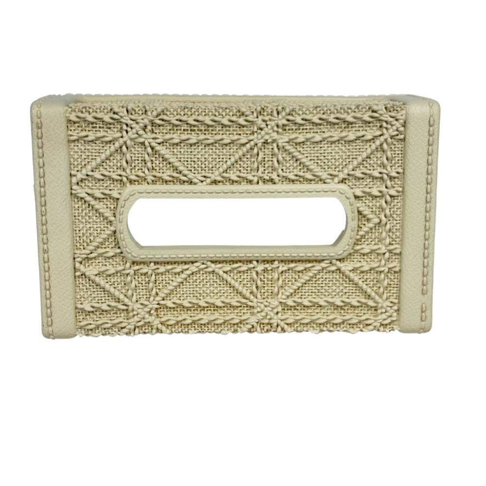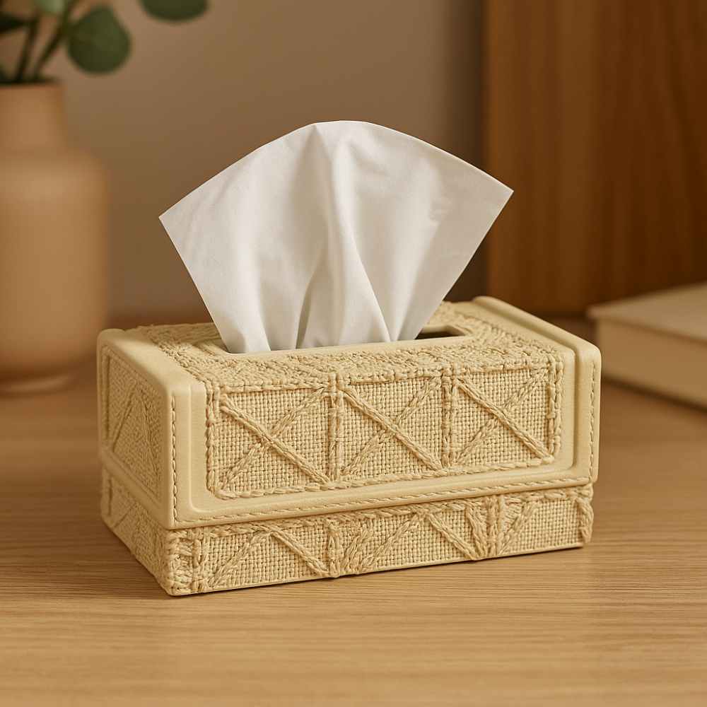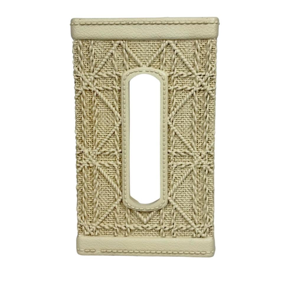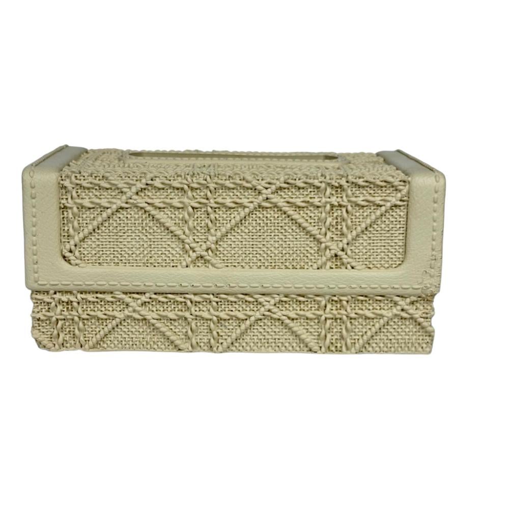 علبة مناديل بتصميم عصري وأنيق تجمع بين الجلد الصناعي عالي الجودة والنقشة القماشية المزخرفة لتعطي لمسة ديكور راقية.