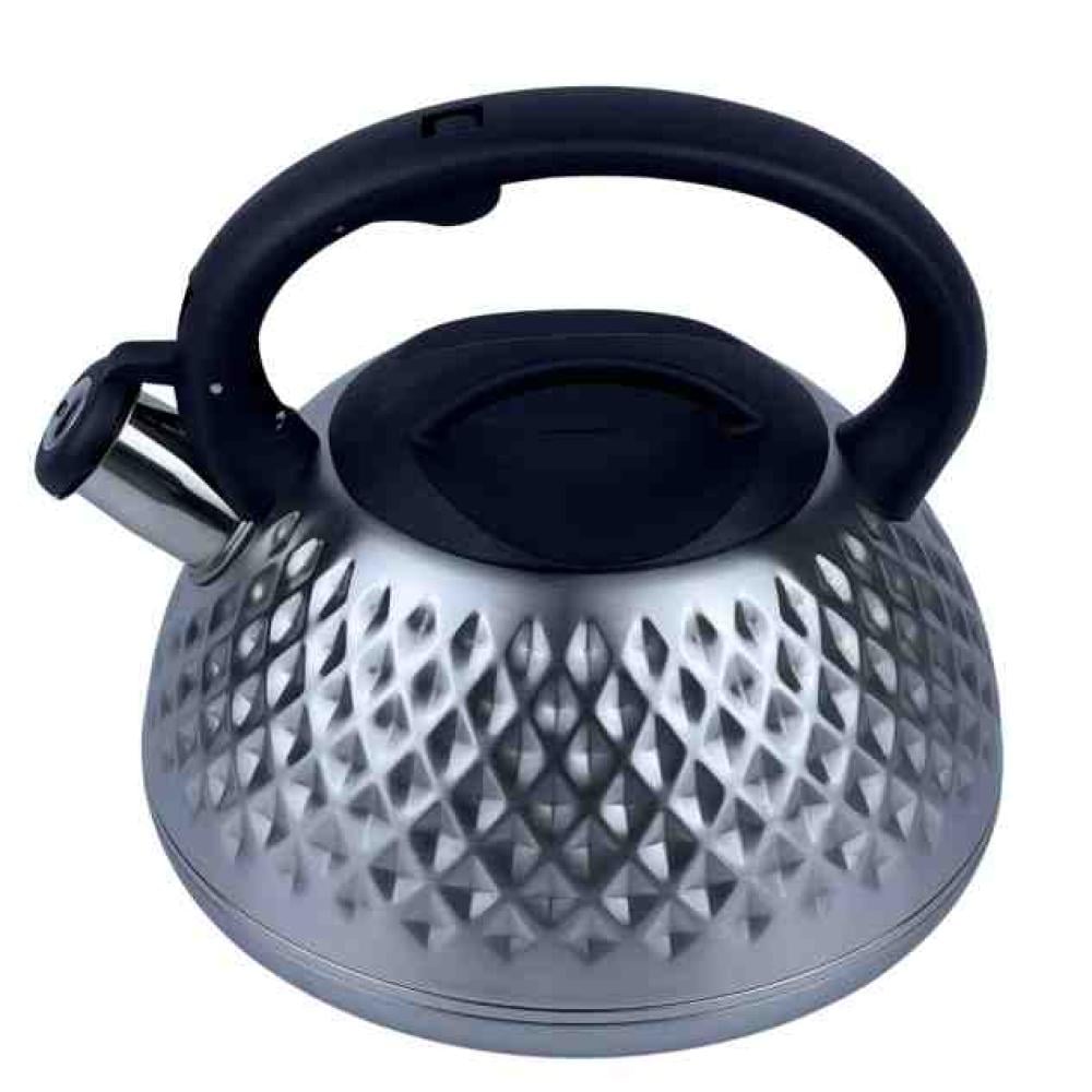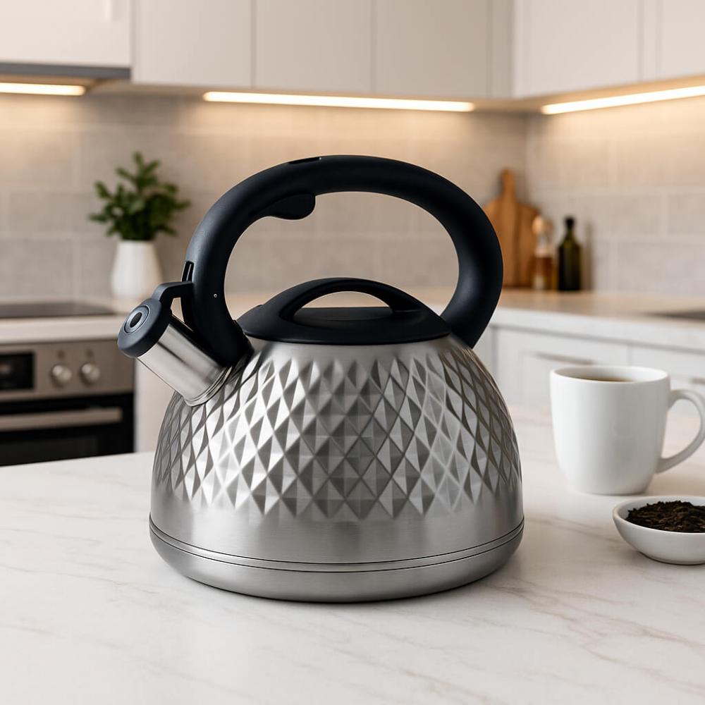 غلاية عالية الجودة بسعة 3 لتر مصنوعة من الستانلس ستيل المقاوم للصدأ، مع مقبض مريح ومضاد للانزلاق. مزودة بصافرة تنبيه عند الغليان لضمان الأمان، ومتوافقة مع جميع أنواع المواقد