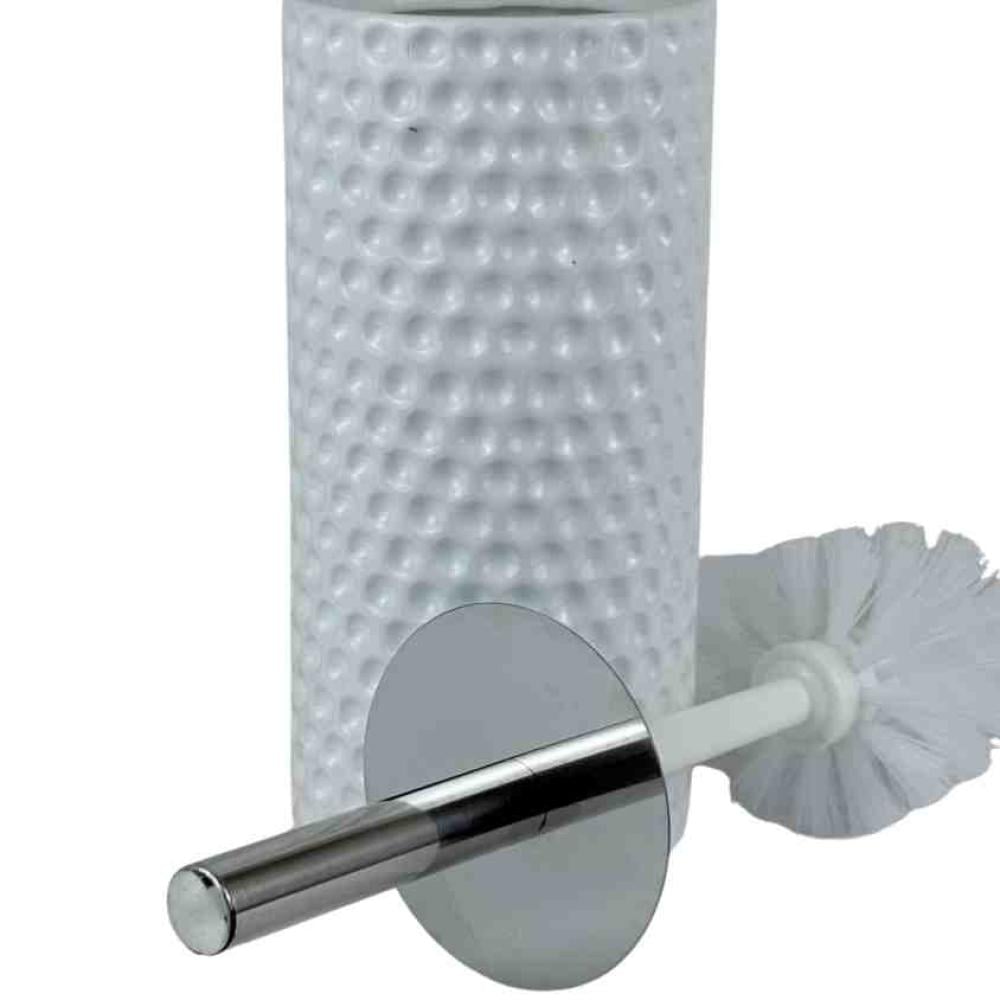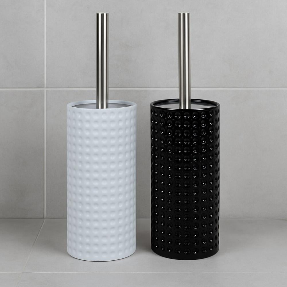 فرش تنظيف الحمام بنقشة بارزة", "description": "فرشاة تنظيف حمام بتصميم أسطواني أنيق، متوفرة بلونين مميزين: الأبيض والأسود، بملمس بارز يمنح مظهراً عصرياً. مزودة بمقبض معدني مقاوم للصدأ لتوفير استخدام مريح، وتعد خياراً مثالياً لإضفاء لمسة من الفخامة على ديكور الحمام الحديث."}