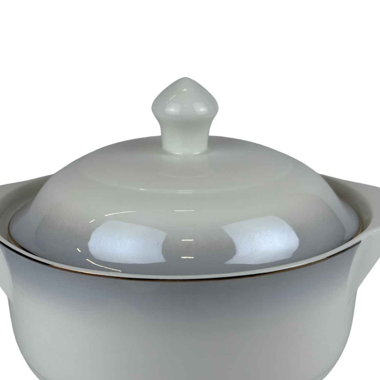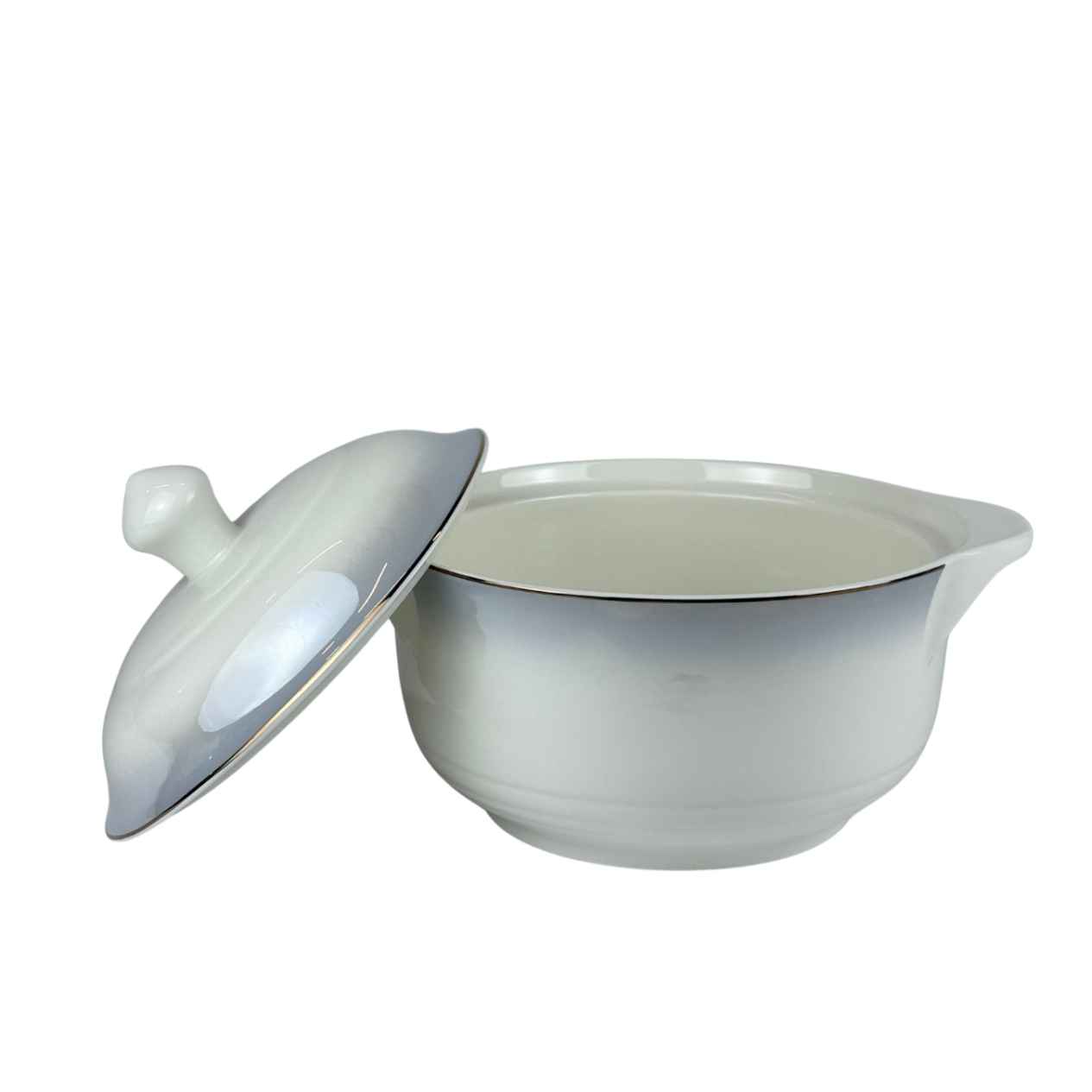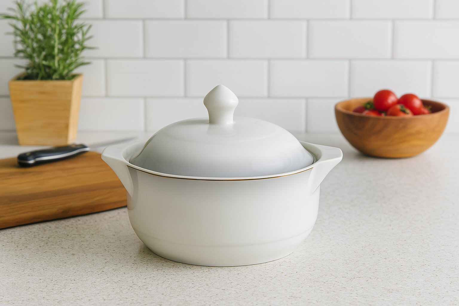 قدر أنيق مصنوع من البورسلان عالي الجودة، يتميز بغطاء محكم وسطح ناعم مع حواف مزينة بخط ذهبي. مثالي لتقديم الأطعمة الساخنة أو الاستخدام داخل الفرن، ويضفي لمسة فاخرة على مائدة الطعام أو مطبخك. مقاوم للحرارة وسهل التنظيف.
