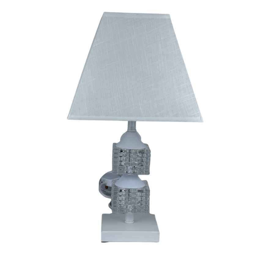 مصباح طاولة أنيق بتصميم كلاسيكي، يتميز بقاعدة مزدوجة مصنوعة من الزجاج المشكّل بشكل هندسي يعكس الإضاءة بطريقة فاخرة. غطاء المصباح القماشي الأبيض يمنح إضاءة ناعمة ومريحة، ما يجعله مثاليًا لغرف النوم أو غرف الجلوس لإضفاء لمسة راقية ودافئة.