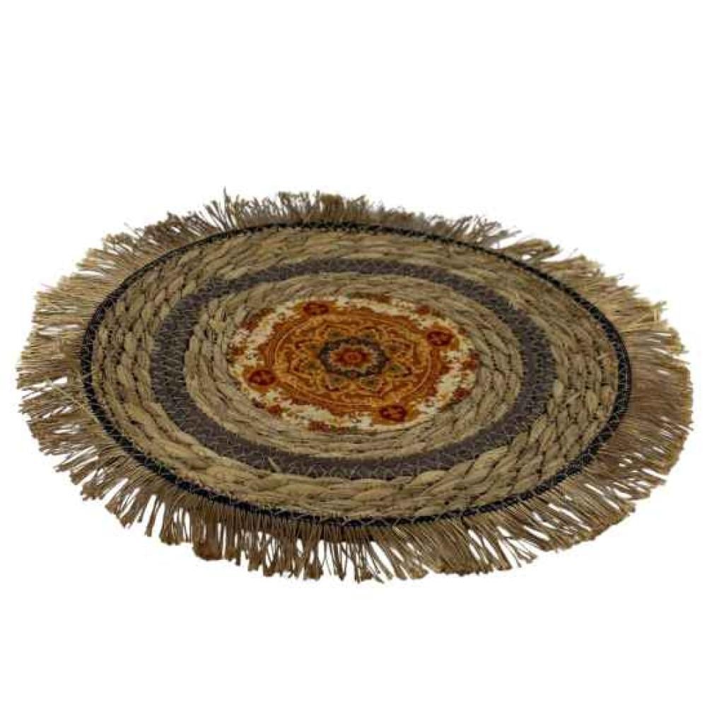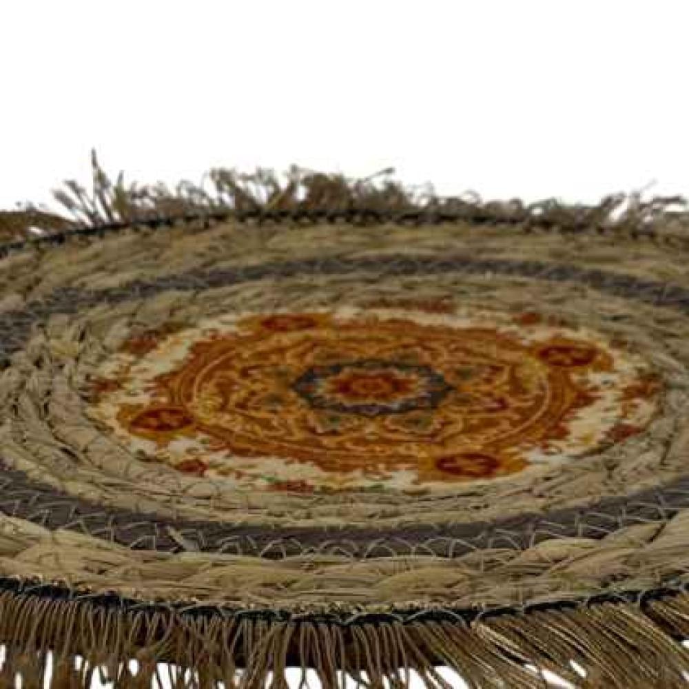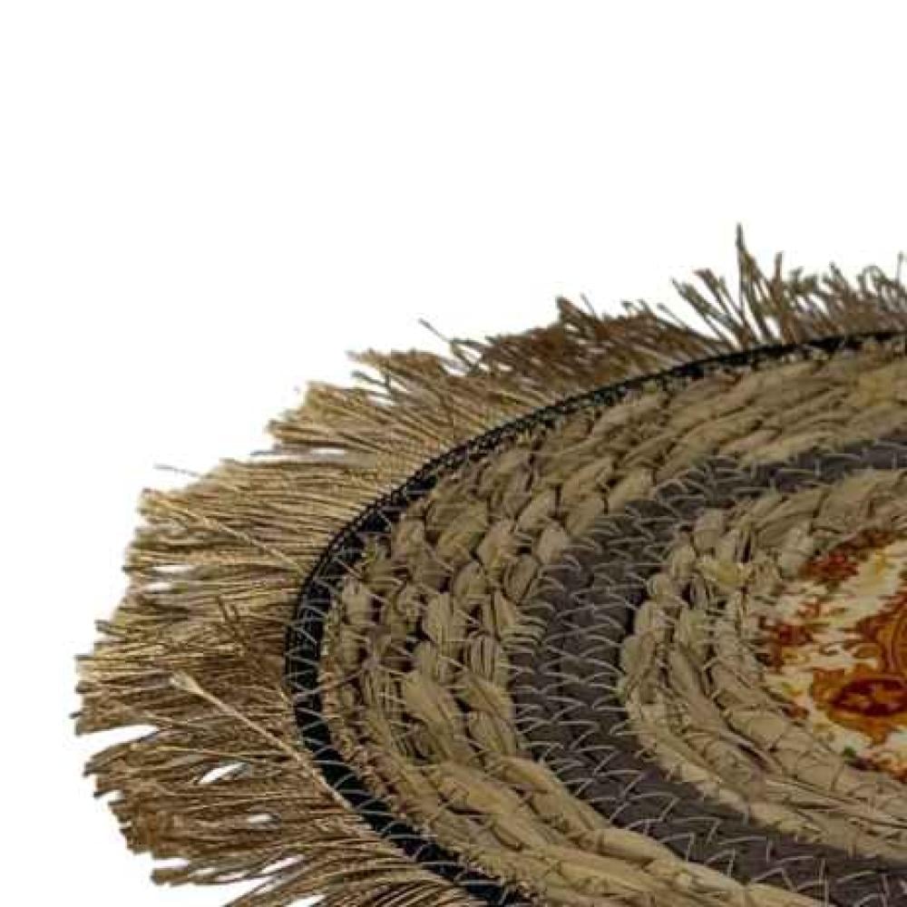 مفرش سفرة دائري بتصميم تراثي فاخر، مصنوع من الخوص الطبيعي المتين ومزين بنقوش شرقية في المنتصف تضفي لمسة فنية أنيقة. يتميز بحواف مشكوكة بخيوط منسوجة تضيف له طابعًا تقليديًا جذابًا، ما يجعله مثاليًا لتقديم الضيافة أو تزيين طاولات الطعام والمجالس. عملي وجمالي في آنٍ واحد، يعكس الأصالة ويضفي دفئًا على أي مكان يوضع فيه.