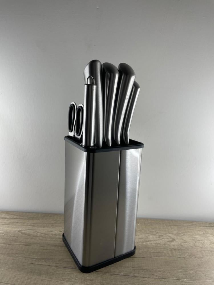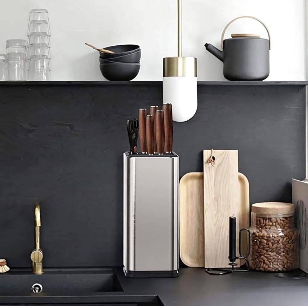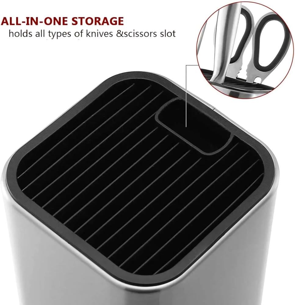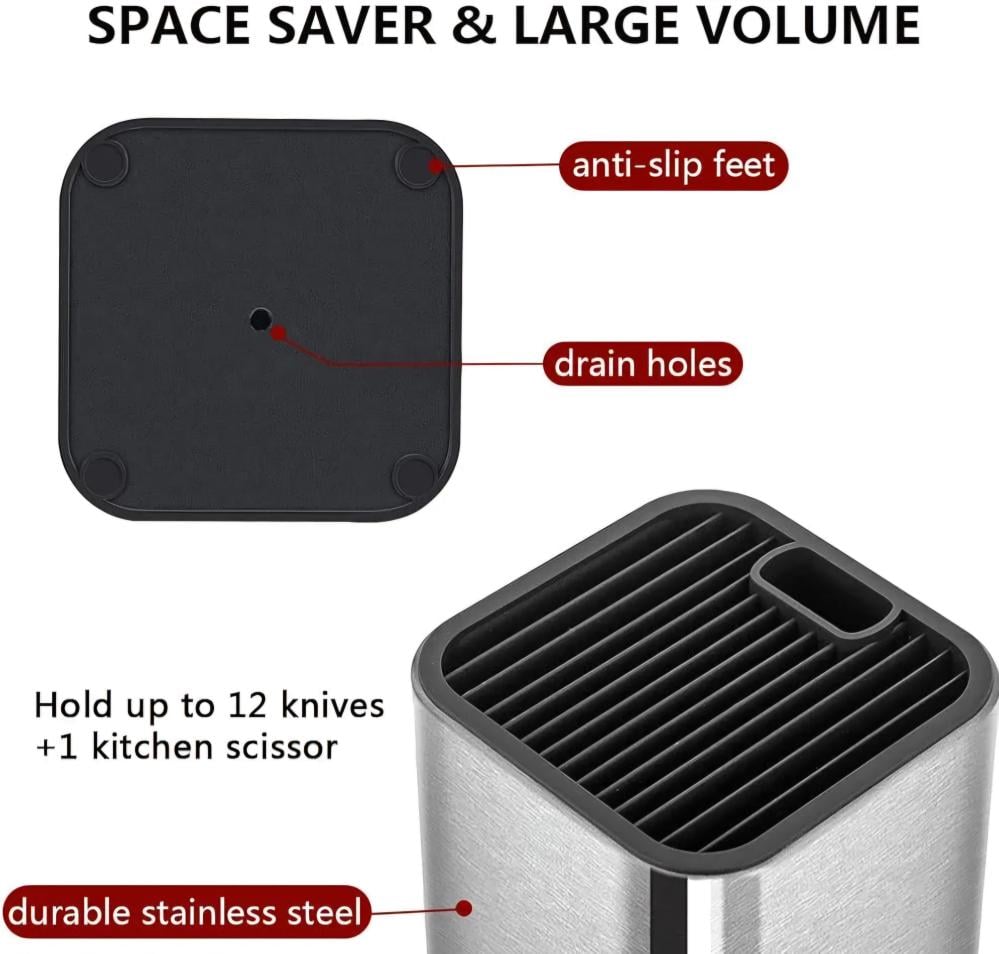 يحفظ سكاكينك آمنة ومنظمة بسعة تصل إلى 12 سكينًا ومقص، مع قاعدة مانعة للانزلاق وفتحات تصريف للحفاظ على النظافة والجفاف. تصميم موفر للمساحة يضيف لمسة جمالية لمطبخك.