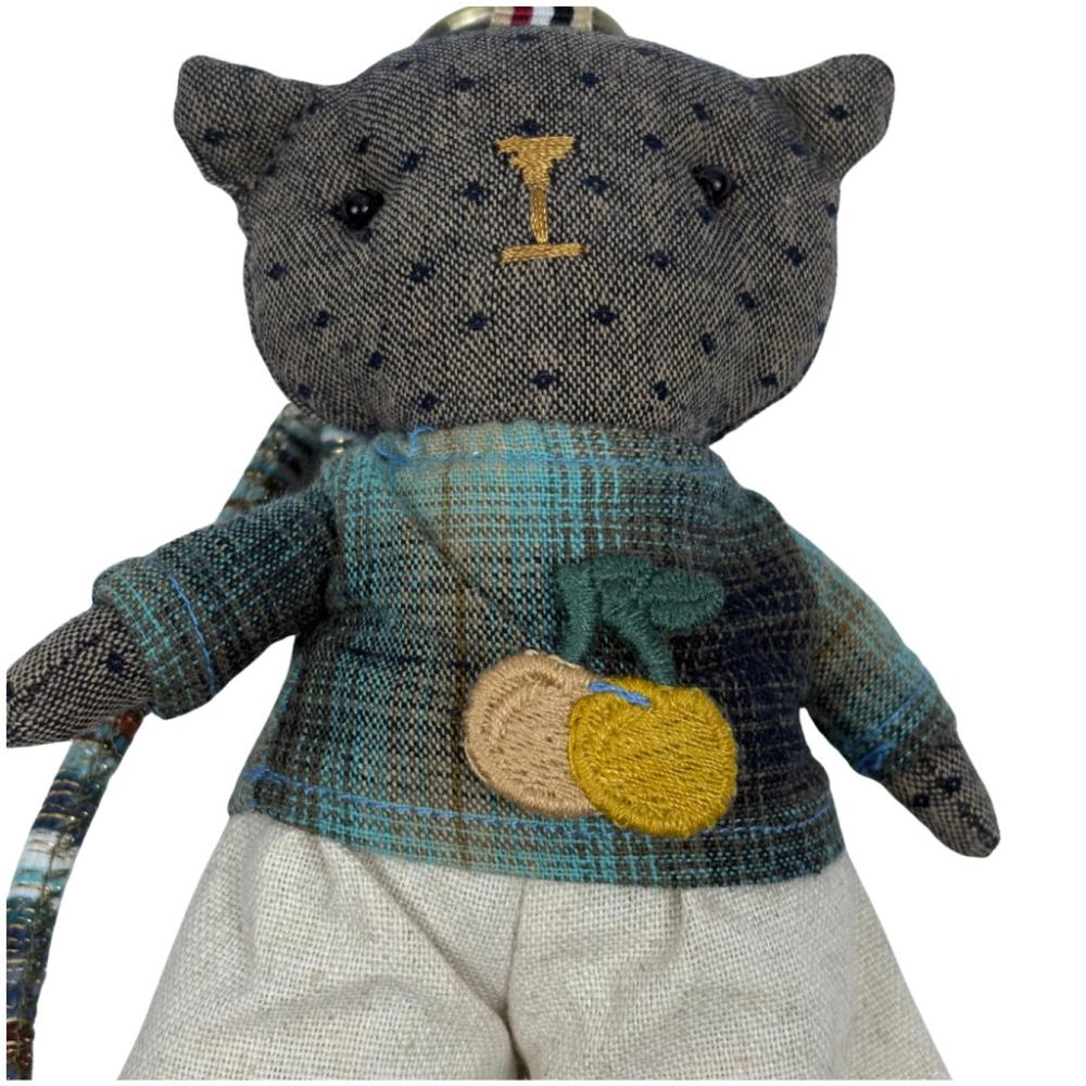 دب صغير مصنوع من قماش منقط داكن مع تطريز وجه بسيط.