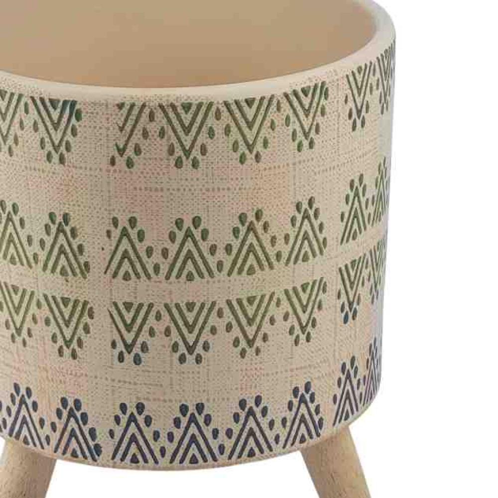 أصيص أنيق بتصميم اسطواني مصنوع من خامات عالية الجودة، مزود بثلاث أرجل خشبية لثبات إضافي وارتفاع مناسب. يتميز بنقش هندسي متكرر بألوان الأخضر والأزرق على خلفية بلون بيج محايد يضفي لمسة فنية فريدة. مثالي لتزيين طاولات الطعام أو الزوايا الداخلية بإطلالة عصرية ولمسة من الدفء الطبيعي.